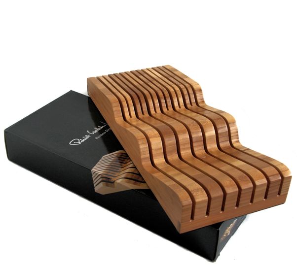 Designerski blok bambusowy, mieszczący maksymalnie 13 noży kuchennych o różnej wielkości. Blok przeznaczony do wyposażenia szuflad lub blatów kuchenneych. zajmujący niewiele miejsca, a mogący pomieścić sporo kuchnnych noży o różnej wielkości. Blok wykonany z bambusu z silikonowymi nóżkami. Wymiary bloku: 40x17x6cm