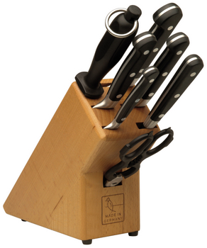 Zestaw kutych noży w bloku z serii "Comfort line" - produkowanych w Solingen, to sprawdzona, niemiecka jakość i uznana na świecie marka. Zestaw noży z serii "Comfort line", złożony z 8 elementów, marki Burgvogel należy do produktów cenionych w świecie noży. Porządna stal wanadowa, solidne wykonanie i ręczne, staranne wykończenie stanowią podstawowy atut tych noży. Są to noże ostre i długo zachowujące swoją ostrość. Razem z klasycznym blokiem otrzymasz skuteczną stalkę - ostrzarkę do noży i praktyczne, ostre nożyce kuchenne, kuty widelec kuchenny i kute noże