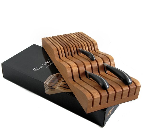 Zestaw angielskich noży kutych o perfekcyjnej jakości z designerskim blokiem, wykonanym z bambusu, w którym można przechowywać dużo większą ilość noży. Leżący blok bambusowy zaprojektowany został specjalnie jako wyposazenie szuflad, ale ze wzgledu na swój oryginalny design z przyjemnością umiescisz go na blacie kazdej szafki kuchennej. Jakość noży kutych, wykonanych bardzo solidnie i profesjonalnie jest wyjątkowa, co dokumentuje także CATRA Report, badając popularne noże na rynku. Skład zestawu: Nóż kucharski 14cm, Nóż kuchenny uniwersalny 14cm, Nóż do warzyw 8cm Blok bambusowy 40x17x6cm, Designerskie pudełko Giftbox, Gwarancja na noże: Lifetime