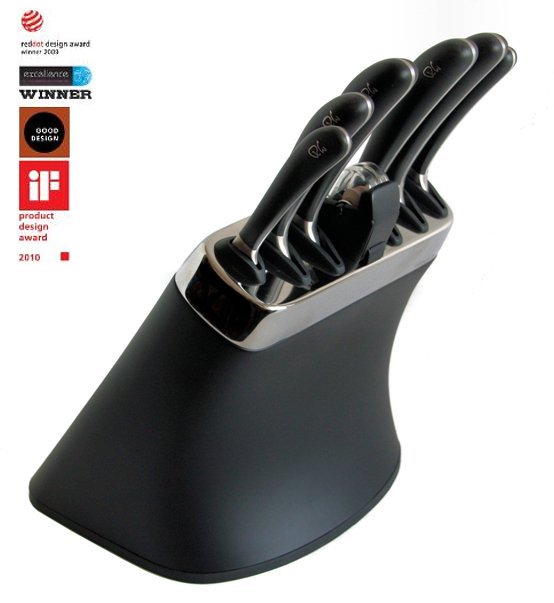 Zestaw angielskich noży kutych z blokiem, wyposażonym w magnetyczny lokalizator, ułatwiający wkładanie i wyjmowanie noży i chroniącym je także przed utratą ostrości. Blok posiada ceramiczny mechanizm ostrzący noże w miejsce którego mozna także wkładać klasyczną stalkę. Jakość noży o perfekcyjnym wykonananiu i długo utrzymujących swą ostrość oraz piękny, designerski blok zapewniły produktowi liczne prestiżowe nagrody, łącznie z ostanią iF - Produkt Roku 2010. Skład zestawu: Nóż do mięsa, pieczeni i ryb 23cm, Nóż do chleba 22cm, Nóż kucharski 14cm, Nóż kuchenny uniwersalny 14cm, Nóż z ząbkami 12cm, Nóż do warzyw 8cm, Ostrzarka ceramiczna, Blok o wymiarach:h22x23x20cm, Designerskie pudełko z rączką