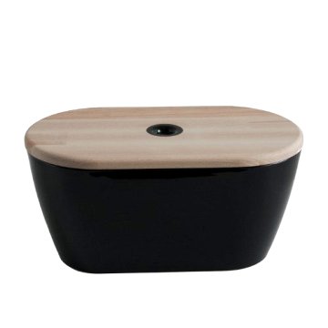 Chlebak Omada Design - pojemnik na pieczywo o wymiarach 35x19cm i wysokości 17cm, wykonany z dwubarwnego akrylu. Chlebak zamykany jest drewnianą pokrywą z akrylową dekoracją, która po wewnętrznej stronie posiada także równolegle frezowane kanały, zbierające okruszki z krojonego pieczywa. Taka konstrukcja deski ułatwia krojenie pieczywa i zapobiega tępieniu noży kuchennych. Wnętrze chlebaka posiada kolor czarny.