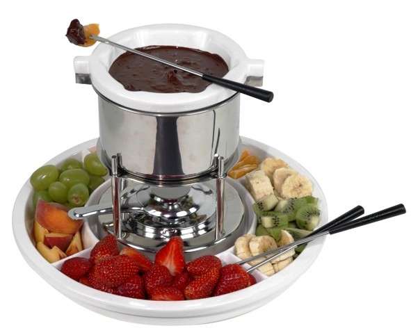 Fondue - zestaw 11 elementowy do fondue czekoladowego i innych. Średnica porcelanowej podstawy wynosi 32cm, podzielona na kilka kompartynentów przeznaczonych na różne owoce i sery. Naczynie do rozpuszczania wykonano z porcelany, pozostałe elementy są ze stali nierdzewnej. Zestaw posiada 6 widelczyków i nierdzewny podgrzewacz.