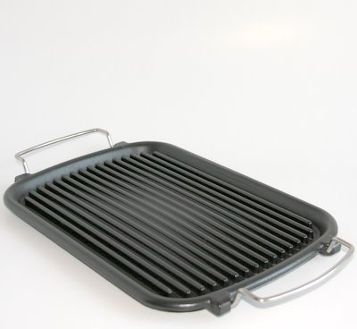 Grill żeliwny - do całorocznego grillowania na każdej kuchni. Uniesione na środku ku górze dno,  względem ustawionego w jednej płaszczyznie rusztu,  pozwala odprowadzić wytopione w czasie grillowania tłuszcze,  warunkując zdrowe przygotowanie potraw. Duża powierzchnia grilla - 37cm x 24cm - umożliwia grillowanie wiekszej ilości potraw. Swobodnie można wykorzystać także płomień z dwóch palników lub wsunąć go do piekarnika.  Grill wykonano z żeliwa pokrytego cienką warstwą emalii i zaopatrzony został w nierdzewne uchwyty do przenoszenia. W pudełku dołączone zostały podstawowe informacje dotyczące użytkowania i konserwacji grilla.