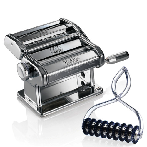 Maszynka do makaronu Atlas 150 Wellness Pastabike to nowa odsłona dobrze znanej w kuchennym świecie maszynki wałkującej ciasto na 10 grubości od 0,2mm do 4,8mm i krojącej typowe włoskie makarony; Tagliolini 1,5mm oraz Fettuccine 6,5mm. Maszynka jest urządzeniem skutecznym i pewnym w użytkowaniu. Gruntowna modernizacja maszynki w ramach programu Wellness połączyła nowe rozwiązania antyalergiczne, eliminujące z wałków i krajaczy nikiel i chrom oraz emisję do ciasta innych zanieczyszczeń z nowym wizerunkiem maszynki, a dołączone informacje i popularne włoskie przepisy jeszcze bardziej wzmagają nasz apetyt na świeży, domowy makaron. Oryginalna maszynka włoska firmy Marcato deklasuje podobne produkty wzorowane na tym urządzeniu w zakresie jakości, czystości i zastosowanych materiałów. Do maszynki dołączony jest dodatkowy przyrząd kuchenny Pastabike, służący krojeniu faworków, szerszych makaronów typu Reginette, szerokich płatów ciasta na Lasagne oraz krakersów i domowych ciastek, a wszystko z pięknym, dekoracyjnie falistym brzegiem.