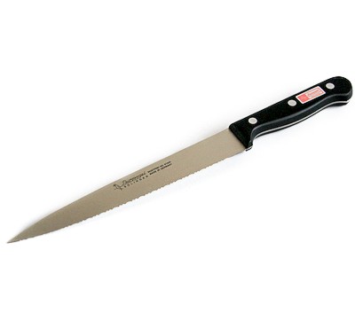 Nóż do pieczywa i wędlin - z lekkim stalowym ostrzem o długości 20cm z charakterystycznym falistym ostrzem i solidnie wykonanymi, nitowanymi rączkami. Noż posiada staranne wykończenie i jest ręcznie, porządnie naostrzony. Przeznaczony do kuchni domowych i gastronomicznych.