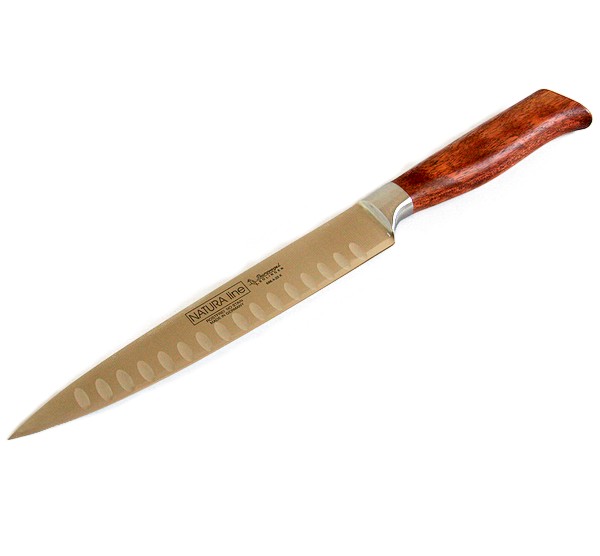 Nóż kuchenny - kuty z jednego kawałka nierdzewnej stali chromowo-molibdenowo-wanadowej. Przeznaczony do krojenia wędlin i szynki. Ostrze posiada obustronnie wykonane, charakterystyczne dla noży japońskich, nacięcia redukujące opory tarcia podczas krojenia i znacznie je ułatwiające. W krojenie wkładamy o połowę mniej siły w stosunku do normalnego noża. Laserowo kontrolowana geometria, zapewnia doskonałe wyważenie noża, a solidne, perfekcyjne wykończenie i staranne, ręczne naostrzenie czynią zeń wielce użyteczny produkt w kuchni. Noże do szynki są ostre, trwałe i nadają się do bezproblemowego krojenia wszystkich produktów spożywczych. Rączki wykonane ze szlachetnego drewna zostały dokładnie wyprofilowane, doskonale leżą w dłoni, są estetyczne i naturalne w dotyku.