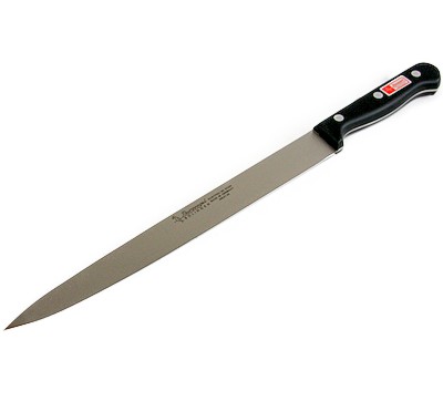 Nóż do szynki i wędlin - z lekkim stalowym ostrzem o długości 26cm i solidnie wykonanymi, nitowanymi rączkami. Noż posiada staranne wykończenie i jest ręcznie, porządnie naostrzony. Przeznaczony do kuchni domowych i gastronomicznych.
