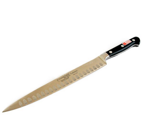Profesjonalny nóż kuty do szynki o długości ostrza 26cm, przeznaczony do krojenia rozmaitych produktów spożywczych i wędlin. Znajdujące się po obu stronach ostrza rzędy nacięć eliminują powstające w czasie krojenia opory tarcia, czyniąc krojenie znacznie lżejszym i łatwiejszym. Korzystając z naszego noża wkładasz o połowę mniej siły w krojenie wędlin. Nóż jest kuty z jednego kawałka specjalnej stali chromowo-molibdenowo-wanadowej, a laserowo kontrolowany kształt noża, zapewnia jego ergonomikę i doskonałe wyważenie. Nóż jest trwały, solidnie wykonany i ręcznie, porządnie naostrzony. Nitowane rączki z polimeru nowej generacji POM, zapewniają swoim kształtem i wykończeniem wyjątkowy komfort użytkowy oraz wysoką odporność na niszczące działanie czynników mechanicznych, termicznych i chemicznych i gwarantuja bezpieczeństwo dla człowieka i w kontakcie z żywnością. Comfort line to linia noży sprawdzona w każdej kuchni!