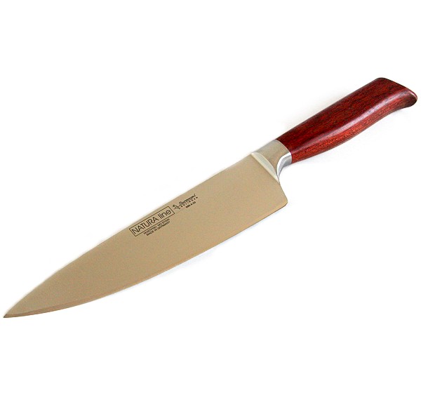 Nóż kucharza - kuty z jednego kawałka nierdzewnej stali chromowo-molibdenowo-wanadowej o długości ostrza 20cm. Laserowo kontrolowana geometria, zapewnia doskonałe wyważenie noża. Nóż posiada solidne, perfekcyjne wykończenie i staranne, ręczne naostrzenie. Te noże są ostre i trwałe. Rączki wykonane ze szlachetnego drewna zostały starannie wyprofilowane, doskonale leżą w dłoni, są estetyczne i naturalne w dotyku. Nóż kucharski jest nożem uniwersalnym, do krojenia, siekania i szatkowania produktów spożywczych.