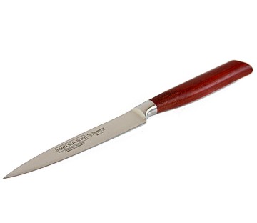 Długość ostrza noża wynosi 12cm, a designerskie rączki, wykonane ze szlachetnego drewna egzotycznego, są eleganckie i naturalne w dotyku. Prezentowany nóż przeznaczony jest do krojenia, obierania i jest takze idealny do przygotowania śniadań.