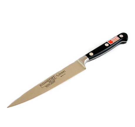 Profesjonalny nóż kuchenny kuty o uniwersalnym przeznaczeniu i długości ostrza 15cm. Nóż kuty z jednego kawałka stali chromowo-molibdenowo-wanadowej o laserowo kontrolowanym kształt, zapewniającym jego ergonomikę i doskonałe wyważenie. Nóż jest produktem trwałym, solidnie wykonanym i ręcznie, porządnie naostrzonym. Rączki nitowane z polimeru nowej generacji POM, zapewniają swoim kształtem i wykończeniem wyjątkowy komfort użytkowy i dużą odporność na niszczące działanie czynników mechanicznych, termicznych i chemicznych oraz bezpieczeństwo dla człowieka i w kontakcie z żywnością. Comfort line to linia noży sprawdzona w każdej kuchni!