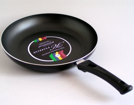 Patelnia głęboka - korpus o grubości 4mm, pokryty ptrójną, grubą warstwą PTFE. Klasyczna linia bardzo dobrych, tanich patelń produkowanych z powodzeniem od wielu lat we Włoszech. Solidny, gruby korpus i trwała, nieprzywierająca powłoka.