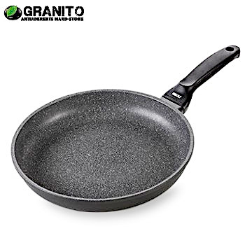 Duża rozmiarowo Patelnia granitowa Granito Risoli jest produktem o porządnie odlanym korpusie, wyposażonym w dno o grubości 6mm. Patelnia Granito została pokryta jedną z najnowszych powłok o dużej twardości, trwałości i odporności na przywieranie. Patelnia jest wolna jest od niebezpiecznych dodatków typu nikiel, kwas PFOA oraz innych podobnych złych komponentów. Czysty odlew EcoCast umożliwia smażenie w jasnych kolorach i bez dodatkowych, przykrych oparów. Powłoka Granito Hard Stone zapewnia także elegancki wygląd naczynia, a solidnie przytwierdzona rączka stanowi dodatkowy atut produktu