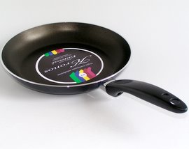 Patelnia - tradycyjna, płytka. Korpus o grubości 3mm, pokryty ptrójną, grubą warstwą PTFE. Klasyczna linia bardzo dobrych, tanich patelń produkowanych z powodzeniem od wielu lat we Włoszech.
