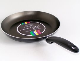 Patelnia - tradycyjna, płytka. Korpus o grubości 3mm, pokryty ptrójną, grubą warstwą PTFE. Klasyczna linia bardzo dobrych, tanich patelń produkowanych z powodzeniem od wielu lat we Włoszech.