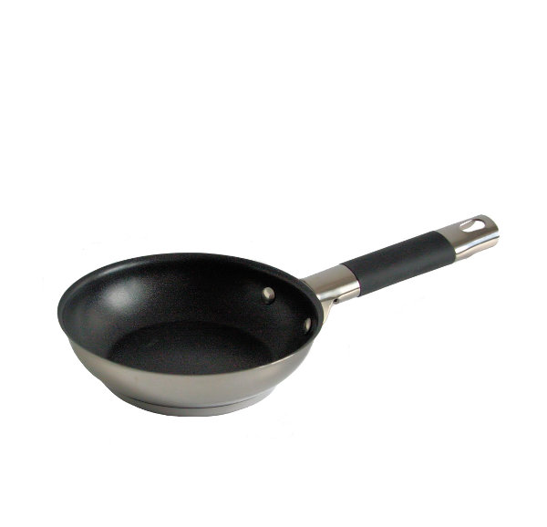 Patelnia teflonowa nierdzewna - o średnicy tylko 16cm, więc bardzo mała, wykonana ze stali chromowo-niklowej 18/10, pokryta autentycznym Teflonem® Platinum - jedną z najmocniejszych aktualnie powłok, odpornych także na zarysowania metalowymi narzędziami kucharskimi. Patelnia posiada mocno przynitowane rączki z silikonową nakładką, chroniącą przed wyśliźnięcięm się patelni z dłonii i dodatkowo przed oparzeniem. Akutermiczne dno przeciwwybrzuszeniowe o grubości 6mm pozwala zaoszczędzić sporo energii w czasie całego użytkowania produktu i umożliwia zdrowe, beztłuszczowe smażenie.