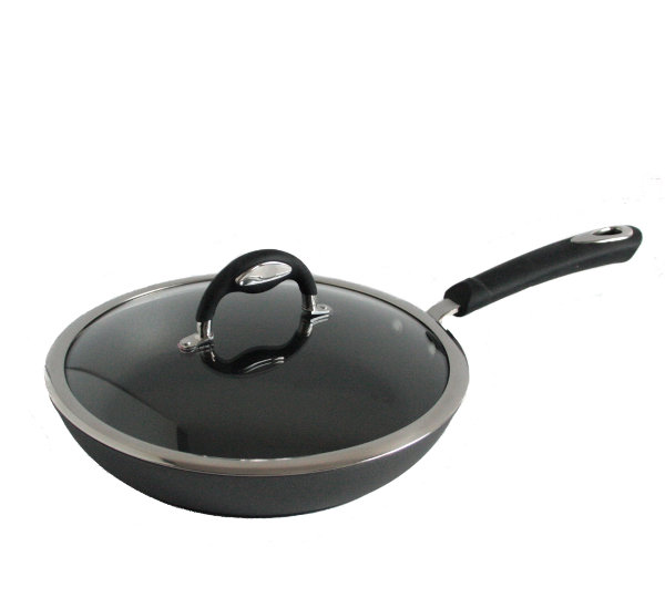 Nowoczesna patelnia z pokrywą "Marcello" - do dietetycznego smażenia potraw z grubszym, tłoczonym korpusem i markową powłoką nieprzywierzającą. Patelnia posiada silikonowe uchwyty umożliwiające korzystanie z tego naczynia także w piekarnikach kuchennych. Pokrywka żaroodporna z rantem obrobionym stalą nierdzewną INOX i oryginalnym uchwytem ozdobionym ażurową aplikacją.