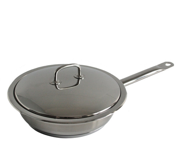 Patelnia nierdzewna z pokrywą - wysokiej klasy produkt firmy Inoxpran z linii "Professional" o 1mm grubości korpusie, wykonanym ze stali kwasoodpornej i dnie wielowarstwowym o grubości 12mm, nadającym się do smażenia na wszystkich rodzajach kuchni, również i płytach indukcyjnych. Patelnia posiada masywną i wygodną rączkę oraz solidną, dopasowaną pokrywę.