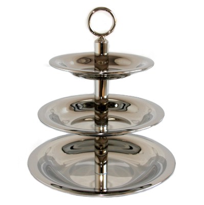Etażerka trójpietrowa - patera na słodycze, ciasta, ciastka i owoce. Wykonana estetycznie z nierdzewnej stali INOX 18/10 o solidnej, stabilnej stopie i trzech głebokich misach, umocowanych na mocnej kolumnie, zakończonej solidnym i wygodnym uchwytem do przenoszenia całego zestawu.
