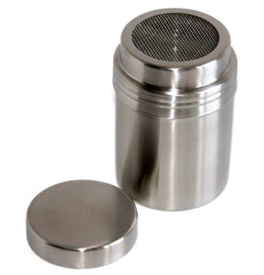 Posypywacz do cukru pudru i kakao - nierdzewny dozownik, posiadający zamiast perforowanej otworkami powierzchni wbudowaną, specjalną siatkę. Także i ten posypywacz wyposażony został w zamykajacą wszystko, nierdzewną pokrywę.