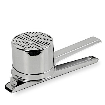 Nierdzewna praska do ziemniaków - wyciskacz włoski do przeciskania gotowanych ziemniaków lub białego sera. Wyciskacz produkowany ze stali nierdzewnej, sprawdzony funkcjonalnie i wytrzymałościowo, dostępny na europejskim rynku od dziesiątków lat. Praska posiada ergonomiczne uchwyty, przyjazne dla dłoni użytkownika. Praska posiada grube ścianki, solidny tłok i otworki o standardowej średnicy 2,5mm, jest skuteczna, bezpieczna i wykonana estetycznie.