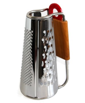 Tarka trójboczna Uniwersalna - o wysokości 19cm, skonstruowana na solidnym, nierdzewnym stelażu o średnicy podstawy 9,5cm, z masywnym uchwytem i grzebieniem do oczyszczania zalepionych ząbków. Tarka została wyposażona w trzy pasy zębów o różnej gradacji; małe otworki do jarzyn i miękkich serów, duże oczka do tarcia warzyw i standardowe, średniej wielkości ząbki do tarcia serów twardych i ziemniaków. Tarka jest wykonana z nierdzewnej stali kwasoodpornej o perfekcyjnym wykończeniu i trwałej, estetycznej rączce, w której jewst także miejsce na oczysczający grzebień. Produkt pakowany w estetyczne pudełko.