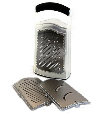 Tarka uniwersalna Micro-Thech - o wysokosci 20cm z czterema, wymiennymi tarczami, wykonanymi w nowej technologii z laserowo wykonanymi ząbkami o odmiennym ich ustawieniu pod kątem i specjalnym wyprofilowaniu ostrzy ząbków. Uchwyt tarki wykonany jest z ABS, a zamykane wnętrze stanowi także zasobnik na wymienne tarcze. Wygodna, stabilna podstawa wykonana z ABS posiada ergonomiczną raczkę, a nierdzewne tarcze montowane są na zatrzaski i posiadają oczka bardzo drobne, średnie i szerokie do jarzyn oraz tarczę do szatkowania o trwałej i najwyższej klasy ostrości.