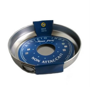 Tortownica nierdzewna - o średnicy 26cm i wysokości 5cm, wykonana z nierdzewnej stali kwasoodpornej o unikatowej i chronionej patentem powierzchni nieprzywierającej. Forma wykonana jest z grubej blachy i posiada wzmacniający rant z okrągło formowanym brzegiem, co pozwala na wieloletnie użytkowanie, bez ryzyka zniszczenia. Brak na powierzchni formy kontrowersyjnych powłok, ulegających z czasem destrukcji, czyni pieczenie zdrowe i bezpieczne. Unikatowa powierzchnia chroni pieczone potrawy przed przywieraniem do formy - Patent na Europę: Brevetto Europeo n.98830713.8. Forma nadaje się więc do pieczenia w domu i każdej gastronomii, jest idealna do ciast i placków a monolityczna konstrukcja, bez rozpinania, chroni przed wyciekami.