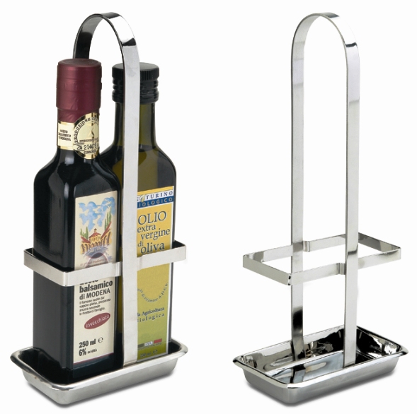 Uchwyt nierdzewny na oliwę i ocet - prosta, nierdzewna konstrukcja na dwie małe, kwadratowe buteleczki oliwy i octu winnego, o pojemności 0.25L, które można zakupić aktualnie w większości sklepów.