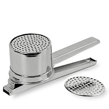 Kuchenna praska do wyciskania ziemniaków gotowanych, warzyw i robienia klusek lanych, znanych jako spaetzle.  Praska jest wykonana ze stali nierdzewnej INOX 18/10 i jest zaopatrzona w dwie wymienne tarcze o różnej perforacji; 2,5mm i 5mm, co znacznie poszerza zakres jej kuchennych zastosowań. Praktyczne i trwałe urządzenie jest bezpieczne dla Twoich dłoni i zapewniające wieloletnie użytkowanie. Wyciskacz jest urządzeniem pewnym i sprawdzonym w użytkowaniu. Praska jest oryginalnym produktem włoskim, produkowanym od dziesiątków lat przez markę Calder.