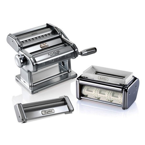 Zestaw do makaronu i pierożków ravioli Pasta Set - złożony z maszynki do makaronu Atlas 150 Classic, przystawki do  pierożków Ravioli oraz  przystawki do Spaghetti. Krajacze makaronu i wałki maszynki wykonane zostały w nowej technologii bez użycia niklu i chromu, a nowa konstrukcja zgarniaczy uniemożliwia dostanie się do ciasta różnego typu zanieczyszczeń. Nowe rozwiązania i wdrożony program Wellness stanowią gwarancję najwyższej czystości produktu oraz jego trwałości i estetycznego wyglądu. Maszynka wałkuje ciasto na 10 grubości, a więc na pierogi, lasagne i różnego typu makarony oraz kroi w sumie trzy najpopularniejsze makarony: Tagliolini 1,5mm; Fettucine 6,5mm oraz Spaghetti 2mm. Dzięki dołączonej przystawce do pierożków formuje także popularne włoskie ravioli nadziewane dowolnym farszem.
