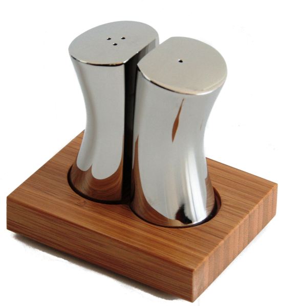Przyprawnik - designerski zestaw do przypraw "Rushan", składający się z dwóch nierdzewnych pojemników na sół i pieprz, umieszczonych na bambusowym cokole. Przyprawnik wykonany w pracowni Robert Welch Designs, wyróżniający się swą niezwykłą plastycznie formą i elegancją wykonania. Wymiary: 9,5cm x 7,5cm x 9,5cm